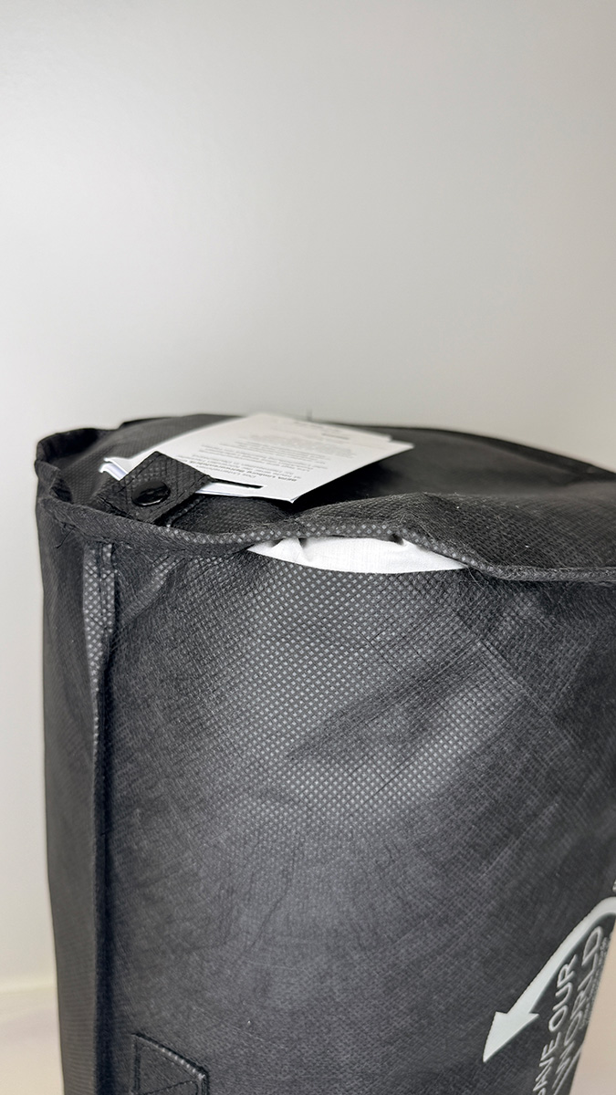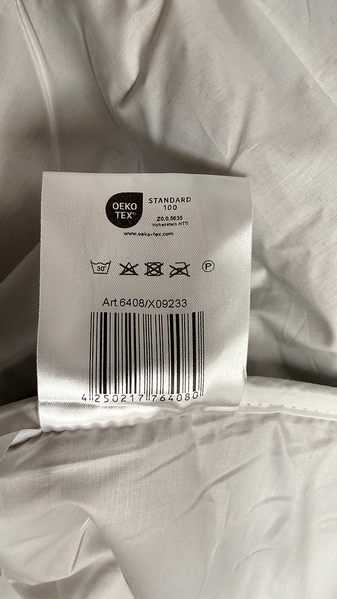 Pflegehinweise sind auf einem Etikett der Bettdecke angegeben – sie ist bei 30° C waschbar und nicht trocknergeeignet. Außerdem ist ein kleiner Dankezettel an der Tragetasche angebracht.
