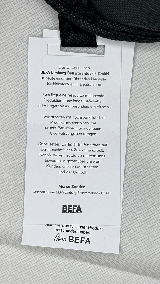 Über BEFA konnten wir bisher nicht viele Informationen finden. Ihre Über-Uns-Seite ist noch leer. BEFA vertreibt Bettwaren – von Decken und Kissen über Bettwäsche und auch Topper. Für Gewerbekunden bieten sie eine exklusive Auswahl an Bettwaren, die optimal für Hotels, Gastgewerbe oder ähnliches geeignet sind.
