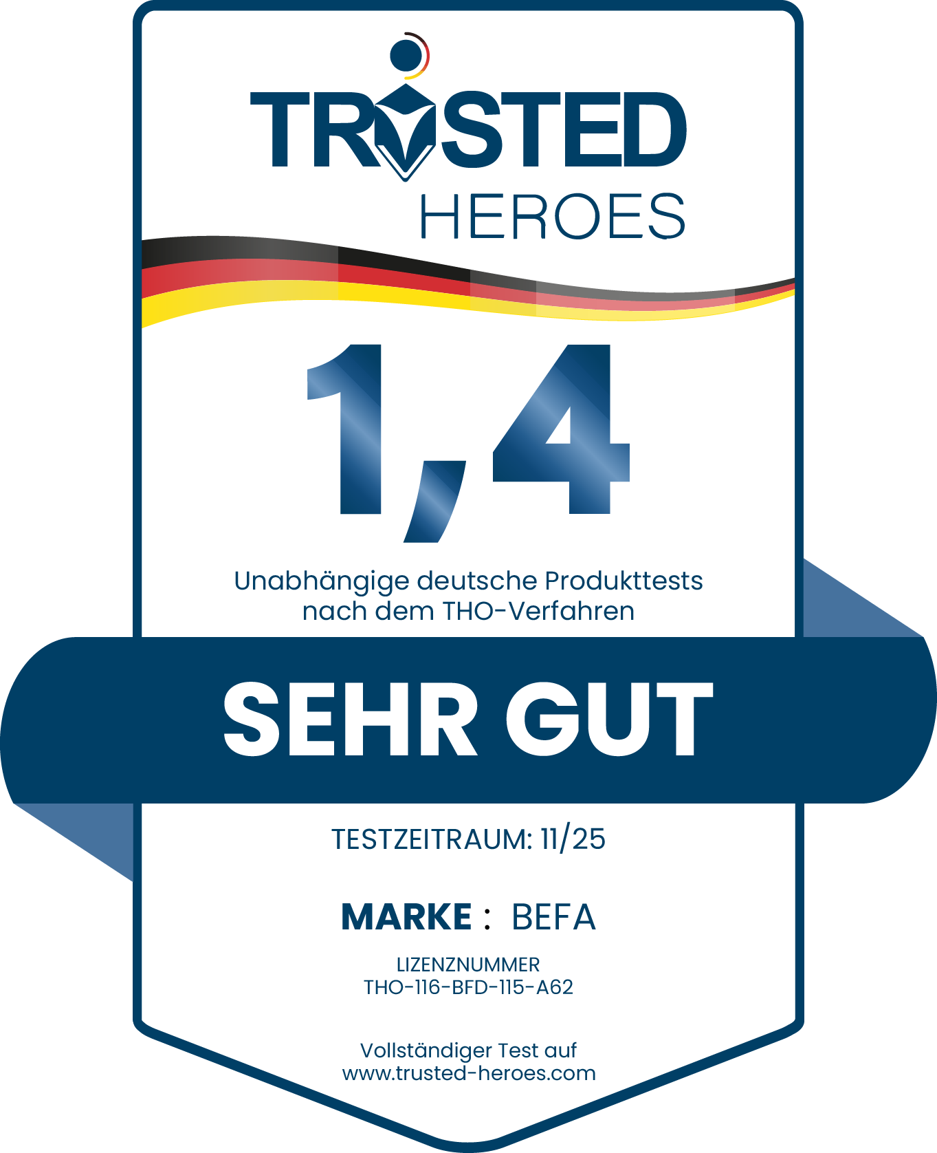 Der Test wurde im Testzeitraum 11/25 durchgeführt und ist in unserer Datenbank unter der Lizenznummer THO-116-BFD-115-A62 geführt.