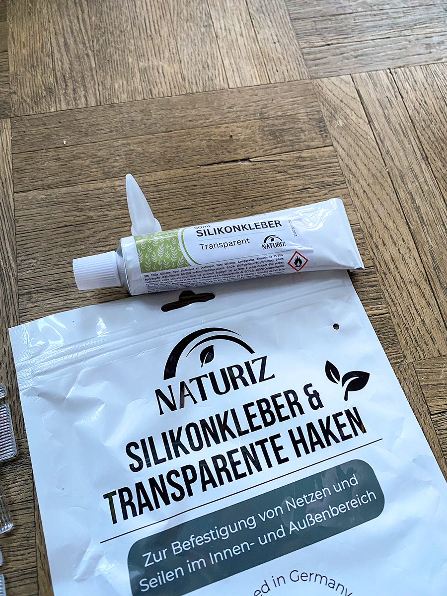 Die Montage der Haken, wie z.B. für ein Katzennetz am Balkon, entpuppte sich als denkbar einfach. Nach Auftragen des mitgelieferten Silikonklebers, der sich durch die Dosierkappe gut auftragen ließ, muss der Haken lediglich an die Wand gedrückt und kurz gehalten werden. Nach 24h Aushärtezeit ist das Silikon eingetrocknet und sorgt für einen stabilen Halt auf verschiedenen Oberflächen. Wir haben die Haken auf verschiedenen Oberflächen ausprobiert: Spanholz, beschichtetes und unbehandeltes Holz, Metall, Kunststoff, Stein und Beton. Auf allen Untergründen hielt der Kleber gut – vorausgesetzt man spart nicht mit dem Kleber und trägt nur einen ganz kleinen Klecks auf. In der 30 ml Tube ist ausreichend Silikonkleber vorhanden.