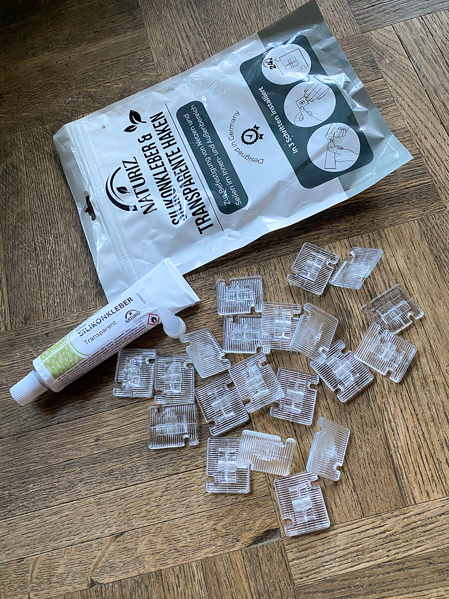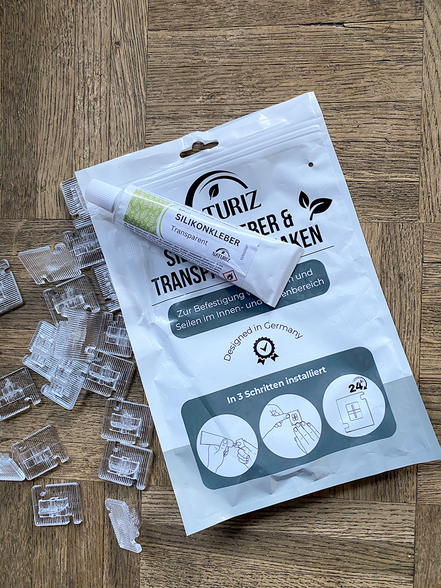 Wir erhielten die Haken samt Silikonkleber zusammen mit weiteren Testprodukten der Marke NATURIZ® innerhalb eines Kartons geliefert. Die Haken mit dem Kleber sind separat in einer verschließbaren Plastiktasche angekommen. Dadurch ließen sich die Pakete gut voneinander trennen und eine gewisse Übersicht wahren. Praktisch finden wir vor allem die wiederverschließbare Tasche, wodurch übrig gebliebene Haken übersichtlich aufbewahrt werden können.