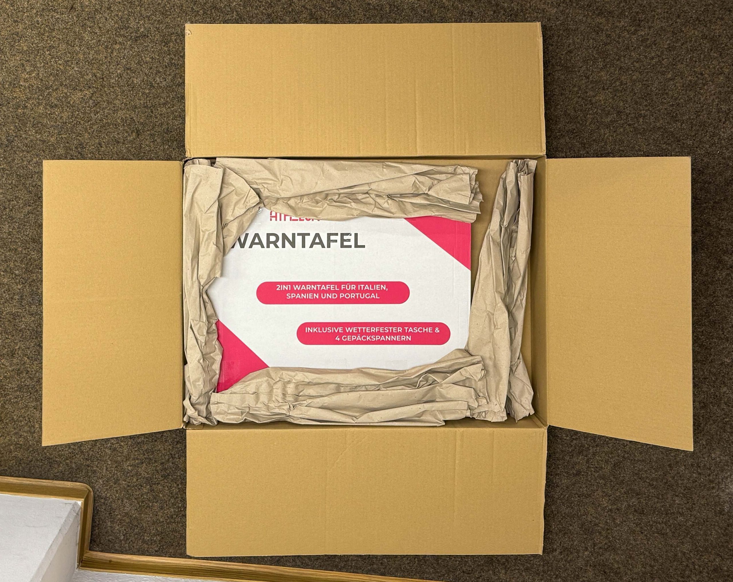Die Warntafel ist gut geschützt in einem Karton angekommen. Hierin befand sich die Warntafel innerhalb der mitgelieferten Tasche, die unter Anderem der Aufbewahrung dient. Die Spanner befanden sich innerhalb des Kartons in Folie verpackt. Auf dem passend in Warnstreifen designtem Karton befinden sich auch Kontaktinformationen, falls Fragen auftreten sollten.
