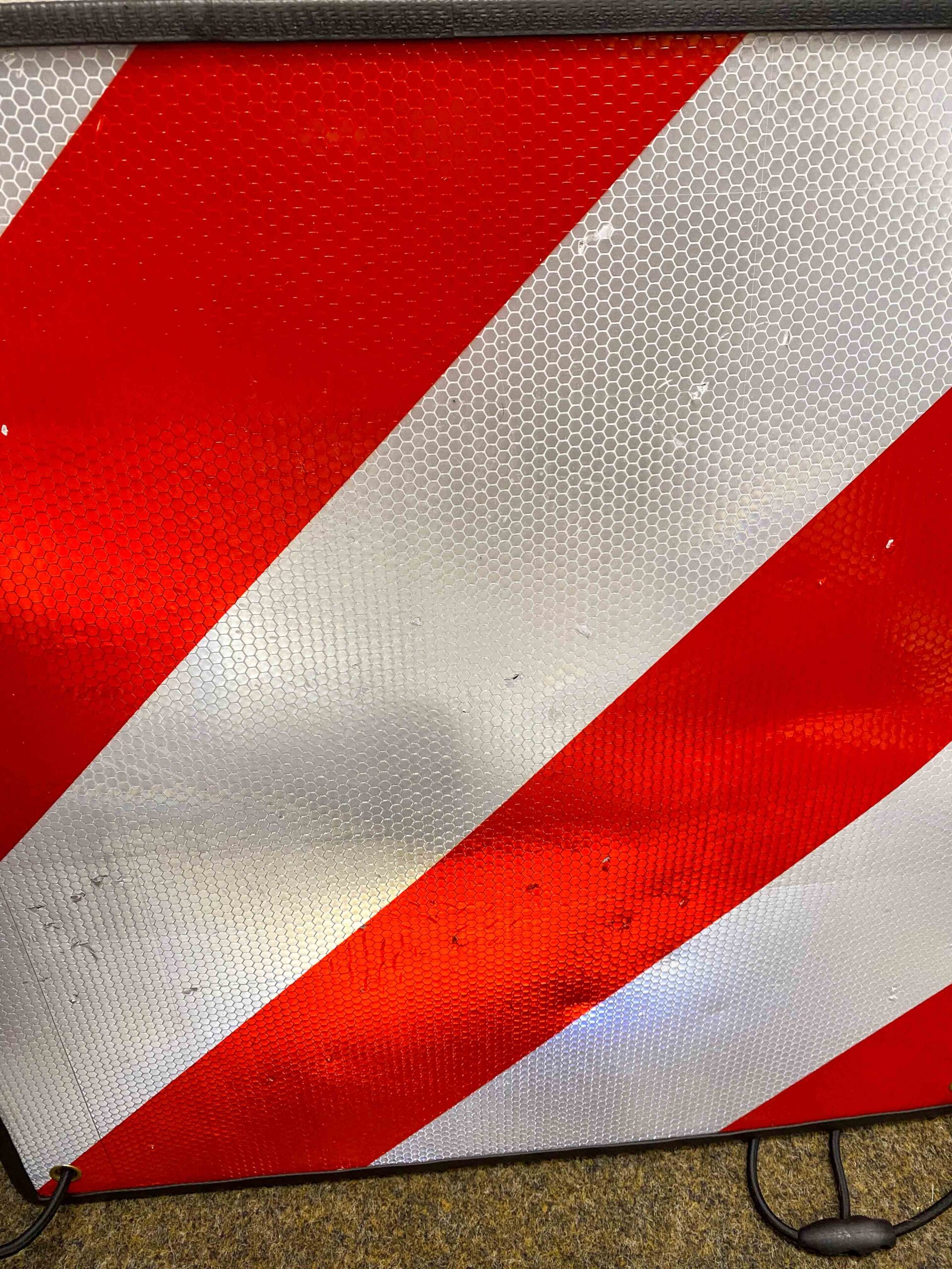 Die Warntafel hat an mancher Stelle einen sichtbaren Streifen, der jedoch keine Beeinträchtigungen in der Reflexionsfähigkeit nach sich zieht. Dennoch gibt es hier einen kleinen Punktabzug, da es nicht so sauber verarbeitet ist, wie ein Kunde dies erwarten würde. Erfreulich ist der aus Gummi bestehende Kantenschutz, der die Tafel zusätzlich vor Beschädigungen schützt.